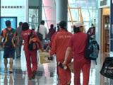 赤い上下のジャージに身を包んだ選手団。一旦、搭乗待合場に荷物を置いたと思ったら、ゾロゾロと歩いてきて、