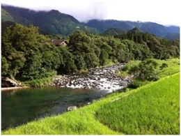 【若山牧水の生家の正面を流れる坪谷川と尾鈴山地】