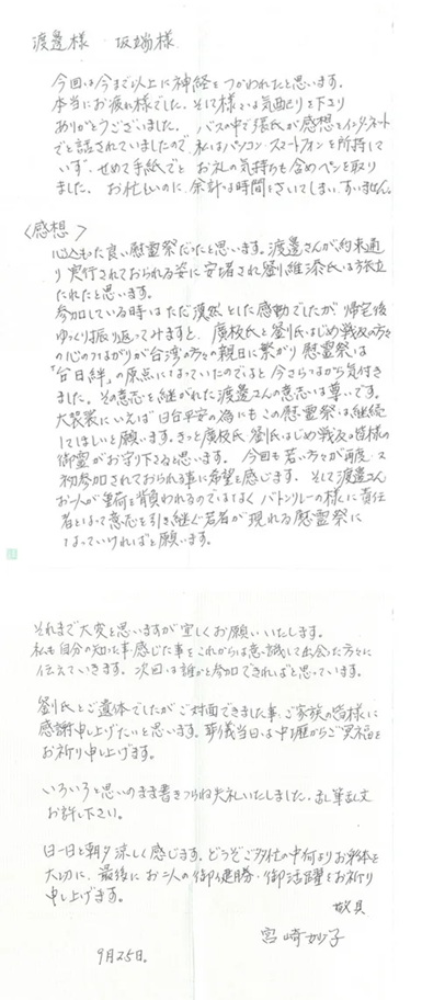 文末に昨年劉維添先生にお届けしたお手紙を添えて、慰霊祭の想い出を締めく