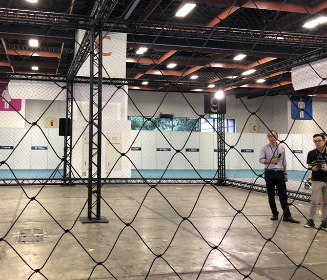 体験コーナーでは、フェンスで囲まれたテニスコートくらいの広さの場所で実際にドローンを操縦しています。