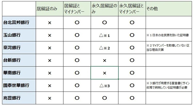 以前は居留証を持たない旅行者でも口座を作れたのですが、今は居留証だけでなくマイナンバーも必須となっています。永久居留証をもっている人はマイナンバーがなくともできる可能性があります。