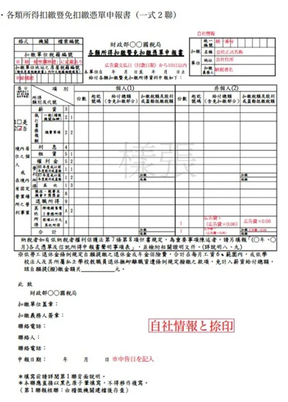まず当該国税局に⾏き、「營利事業所得稅扣繳憑單」と「各類所得扣繳暨免扣繳憑單申報書」の⽤紙を受け取ります。そして、下の画像のようにそれぞれ記⼊します。