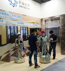 人型ロボットも、少数ですが、展示しています。これは、ロボットホテルを設定しています。