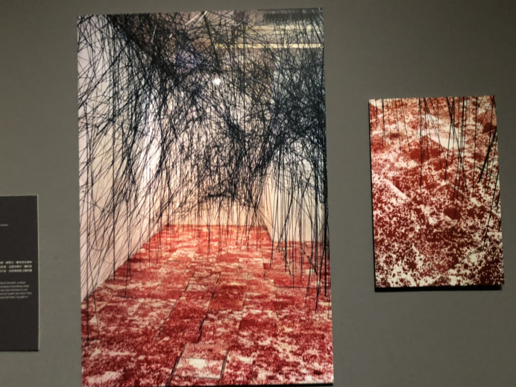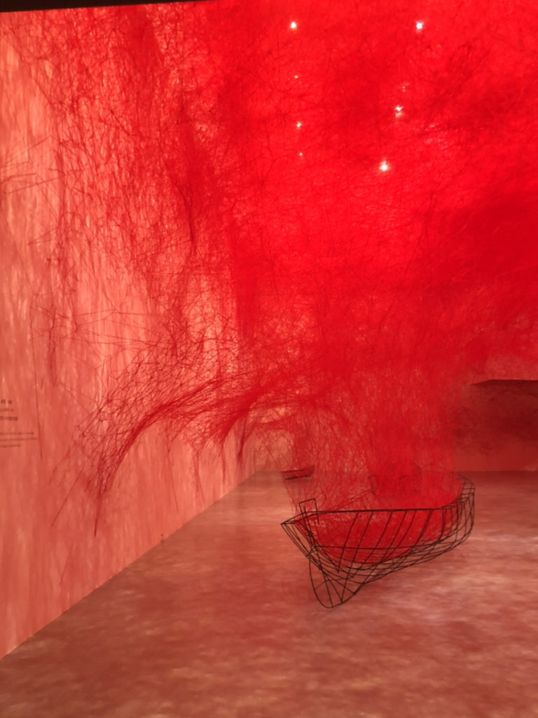 接下來,我們進入到了大型裝置藝術的展區。在還沒有來展覽之前,光是透過網路上的訊息,就足以讓人感受到其壯觀,實際看到的那一瞬間真的太震撼了,也突然感覺到自己的渺小。原來藉由不斷交錯的紅線,也能完成如此令人讚嘆的作品。