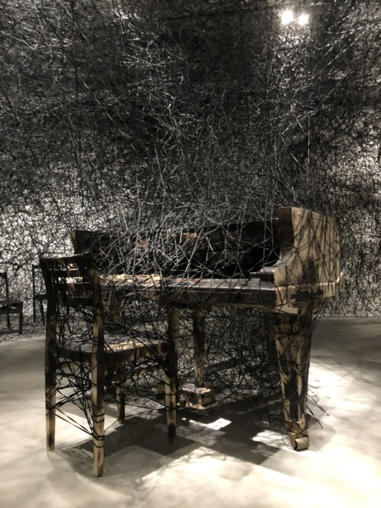 ここでは、赤の糸を黒の糸に置き換えています。赤の糸ほど強めの視覚的なインパクトはありませんが、黒の糸の世界観は同じように印象が強く、非常に強い個性を持っています。ピアノと椅子の周りにたくさん黒の糸で囲まれたインスタレーションアートも気に入っています。