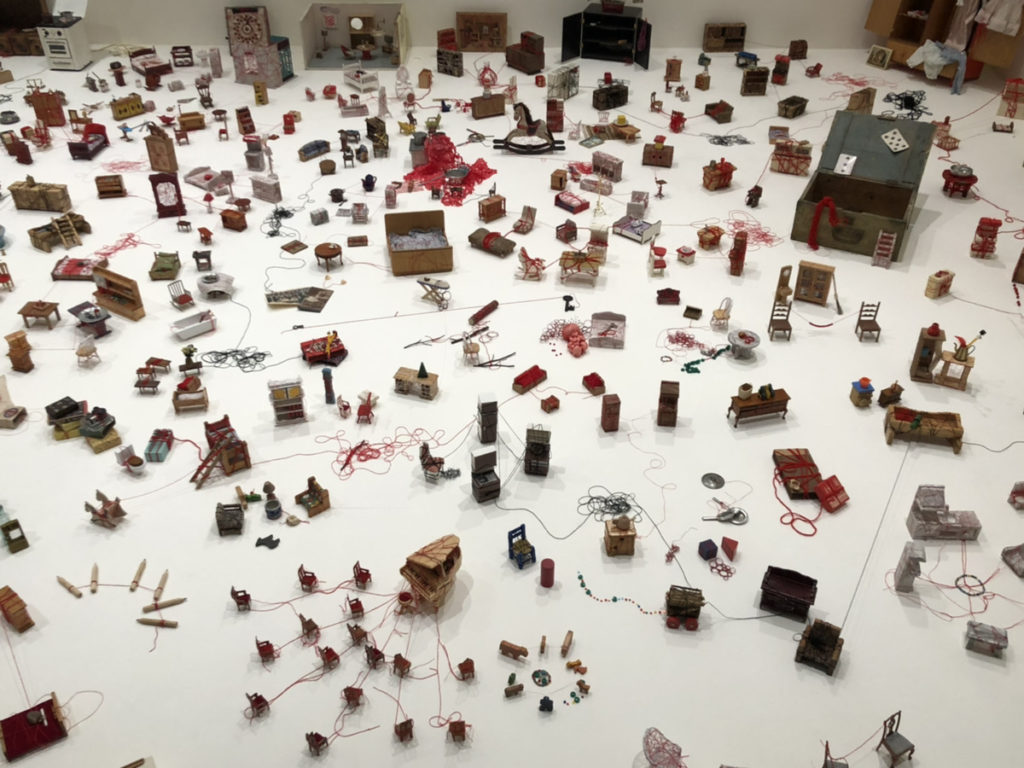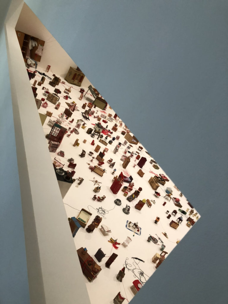 在迷你模型區裡,原本以為只是把不同的小模型擺在一起,但靠近一看,才發現有些相關的物品都被紅線串在一起了。在這個展示間裡的正對面牆壁上開了一個小洞,原本還不知道用意是什麼,等到走到後面才發現原來是不同的視覺感受。
