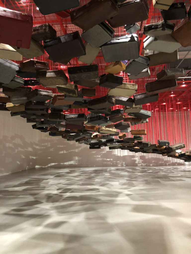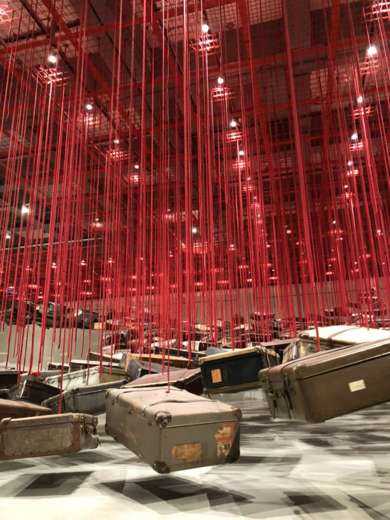 上記2つのエリアの隣には、これまた驚くべき大規模なインスタレーションがあります。赤の糸にはたくさんのスーツケースがぶら下がっています。