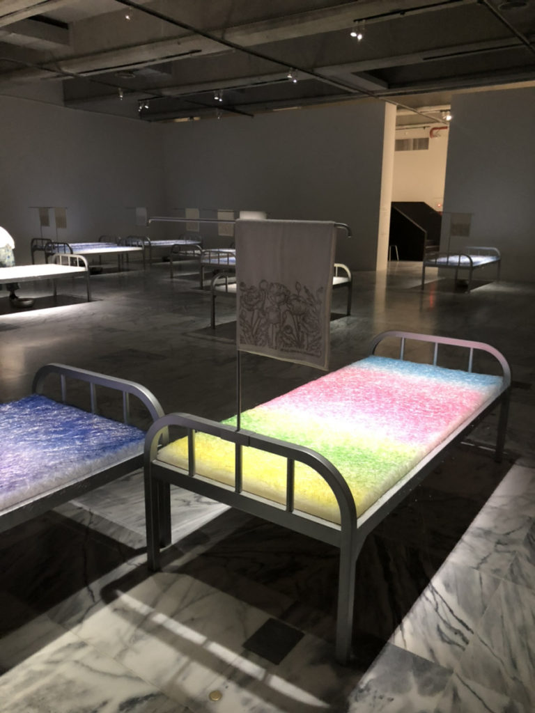 次の作品はベッドに針が張られ、色とりどりの糸が張られ、ベッドの頭には星座の刺繍が施されたタオルがあり、星占いを参考にしてベッドの位置を決めています。