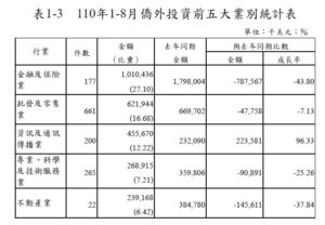 2021年1月-8月の国外から台湾への投資概要