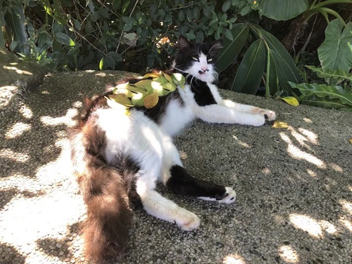 課外学習の学生さんに葉っぱを乗っけられても起きない猫ちゃんが。