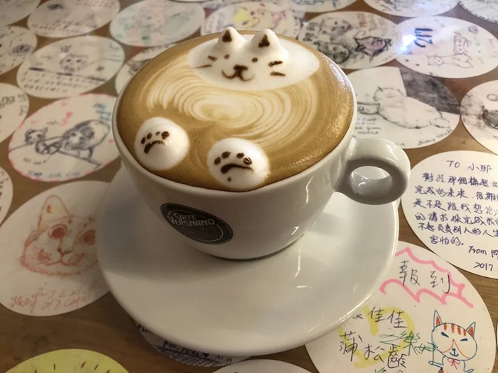 こちらのカフェラテ(120元)で日本人に有名なのが、可愛らしい白い猫がカフェラテに浮かぶラテアート。
