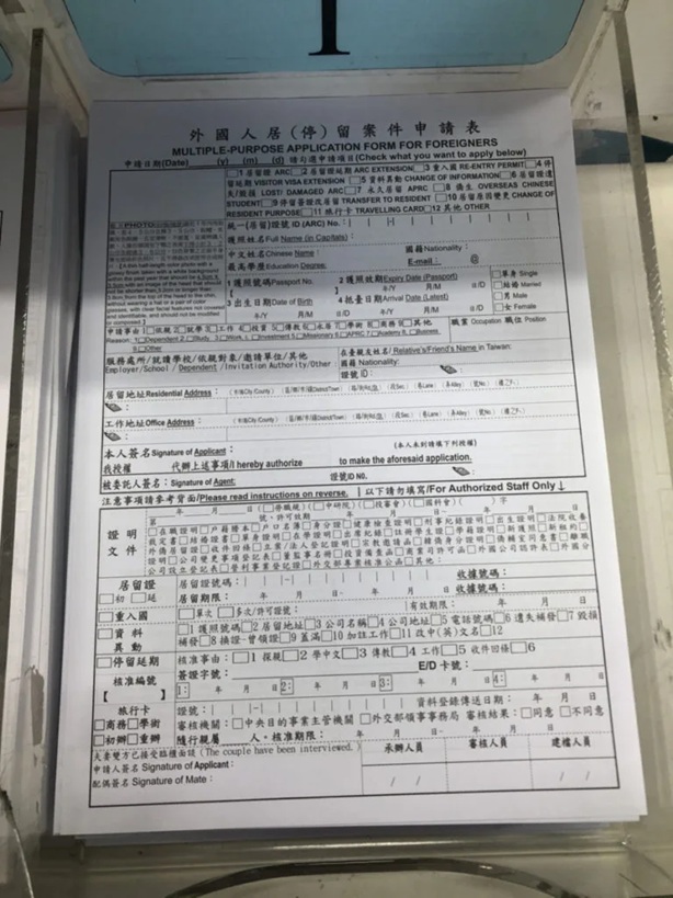 その後、目的を告げて整理番号と申請書類を受け取り、近くの机で必要事項を記入します。(台湾の知り合い等の項目については記入する必要はありませんでした)